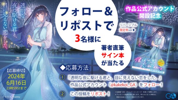 2024年9月上旬までに、『夜が明けたら朝が来る』公式アカウント(@kakekoi_GA)から、当選者へDM(ダイレクトメッセージ)を使って通知します。