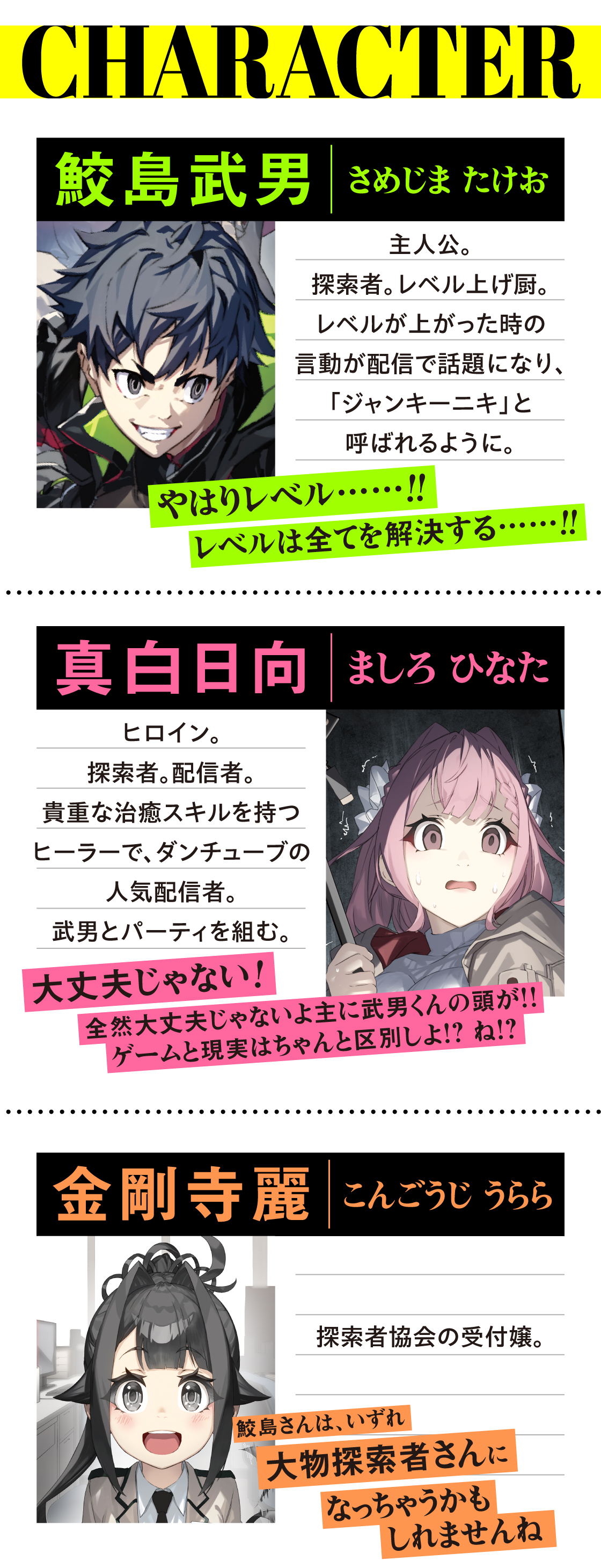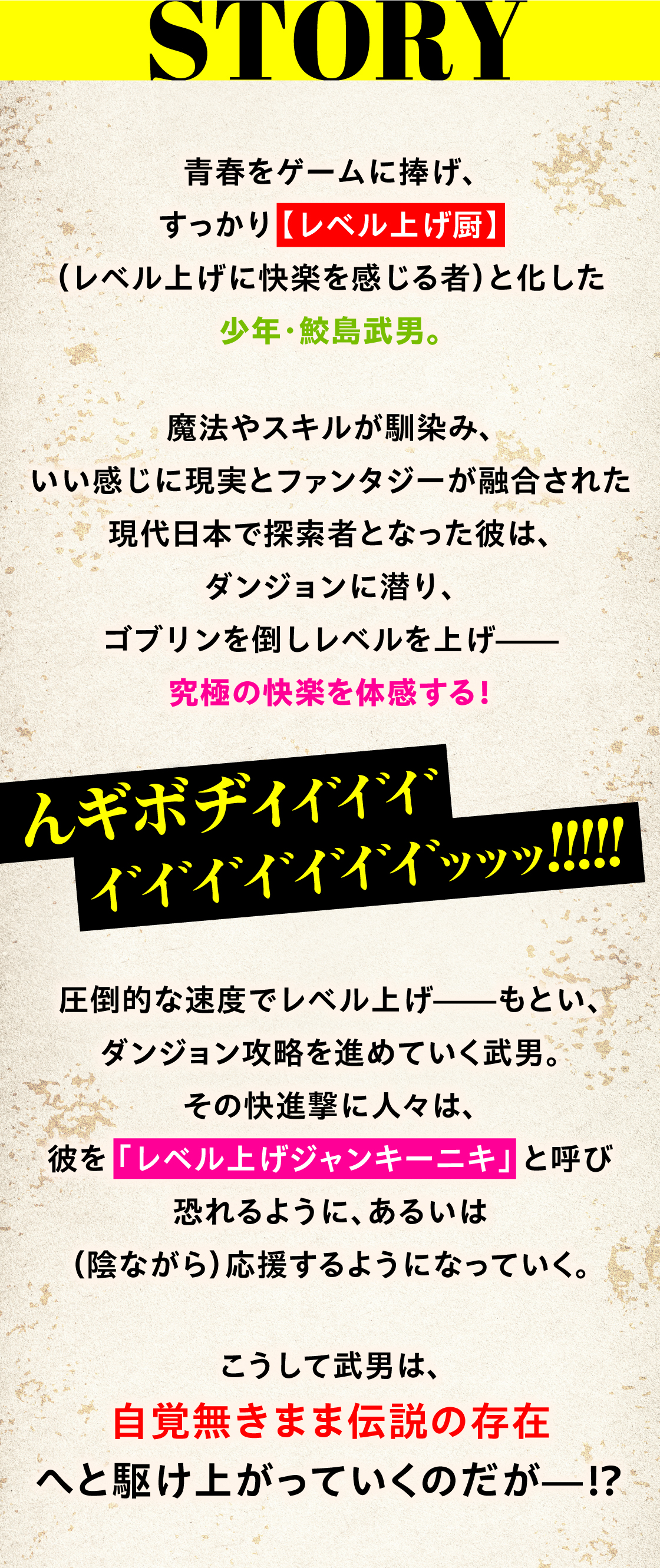 (レベルアップに快楽など感じない)常人からはとても理解できない奇行を繰り返しながらも、圧倒的な速度でダンジョン攻略を進めていく武男。その快進撃にいつしか界隈は、彼のことを「レベル上げジャンキーニキ」と恐れ、あるいは(陰ながら)応援するようになる。